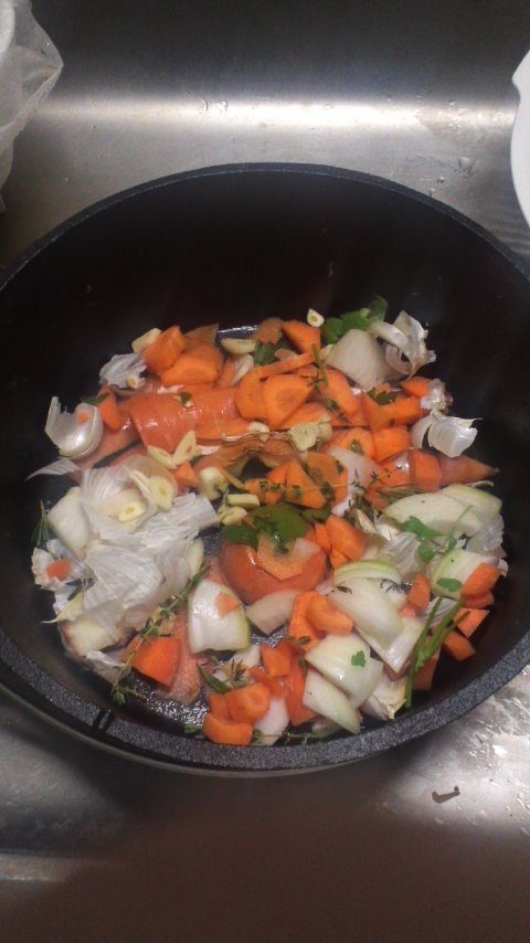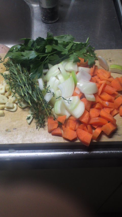 2.にんじんは小口切りに、玉ねぎは乱切りに、にんにくはスライス状にします。ハーブは適当な長さにちぎります。ここででたくずは後で使うのでとっておいてください。