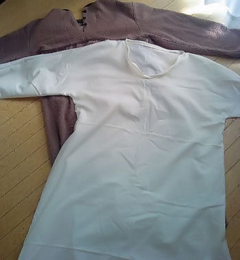 型紙を使わないバージョンにしています。奥の茶色い服が現代服(厚手のチュニック)、それをもとにして作ったのが手前の白い服です。